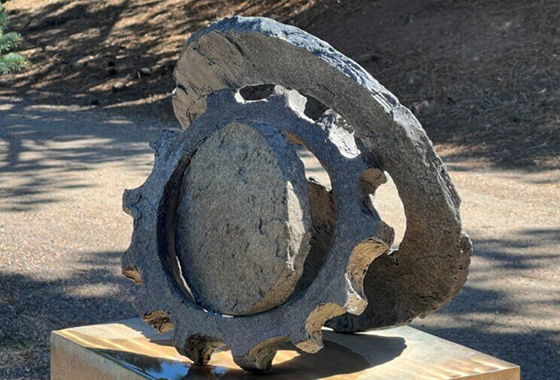 Endless Time was inspired by a large stone, gear-shaped object the artist had seen during her travels in Turkey. Endless Time initially was displayed at Hudson Gardens as part of a temporary art exhibit in 2000. Upon her retirement from sculpting, Jan donated all of her sculptures to local organizations. Hudson Gardens was selected to become the permanent home to Endless Time in 2020. Endless Time is located in the Conifer Grove overlooking the South Lawn.