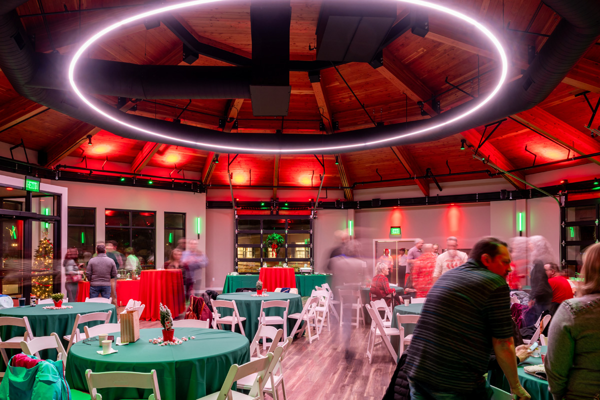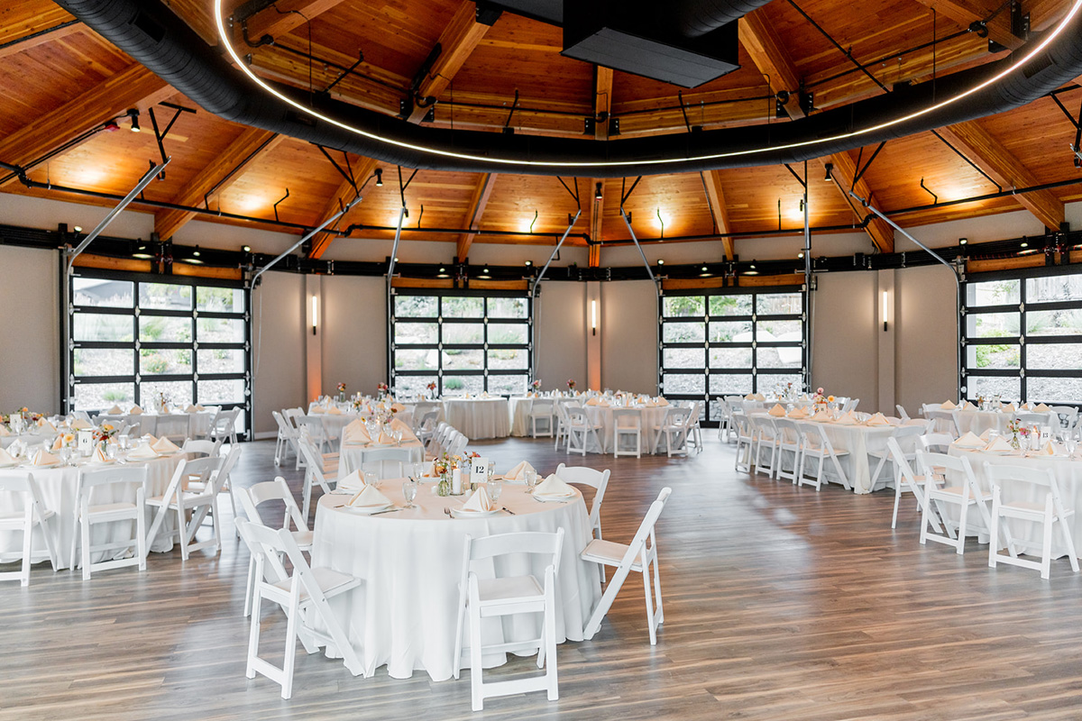 The Bloom Room is our newest venue and has quickly become a favorite, with its rustic chic style that includes beautiful natural wood beams and trusses, wrap-around windows, and walls that roll up for an open-air or an enclosed experience.